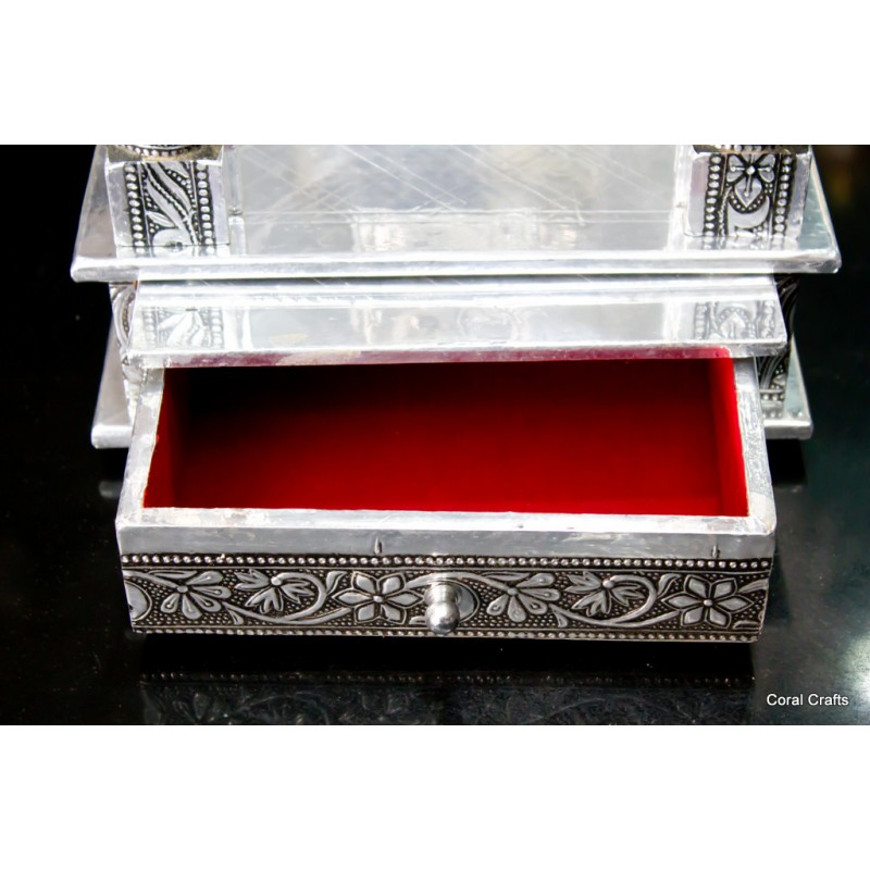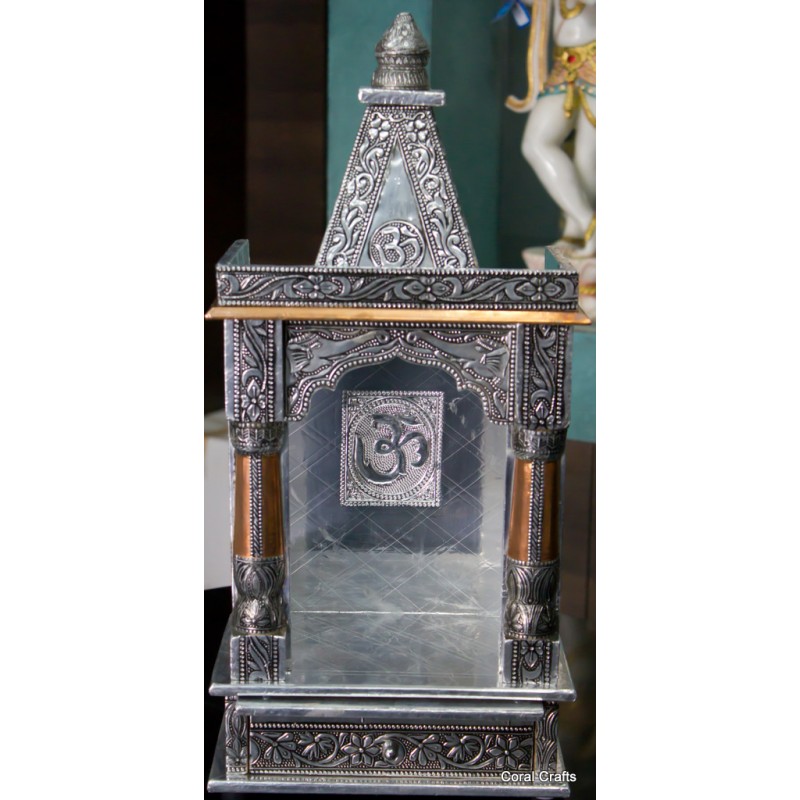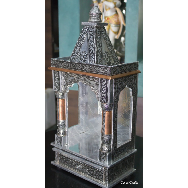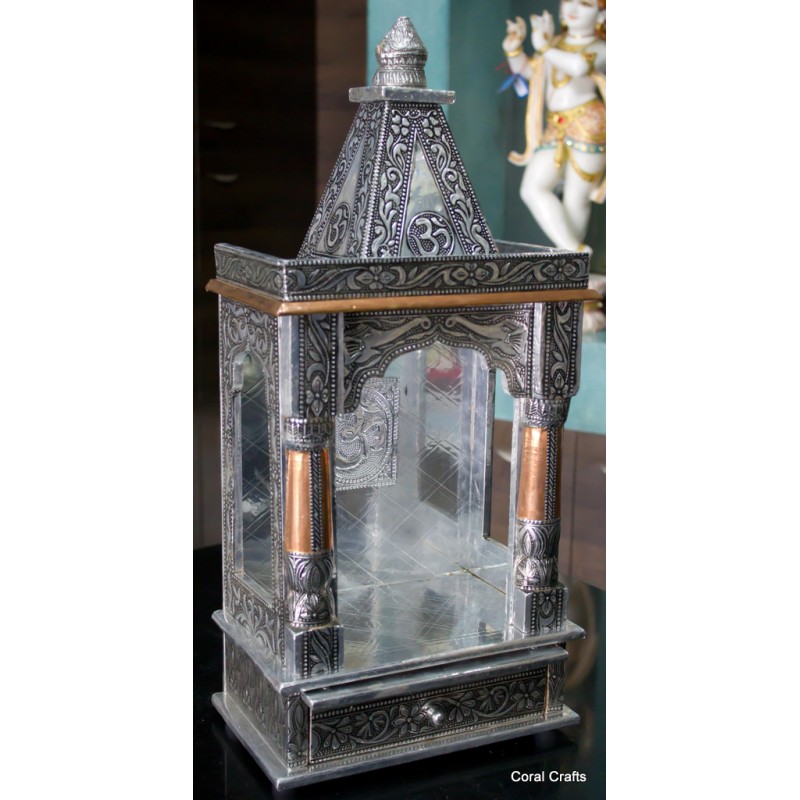Oxidized mandir erected from plywood and plated oxidized aluminum and copper. Oxidized temple uses tarnish proof and rust proof screws with quality nails.