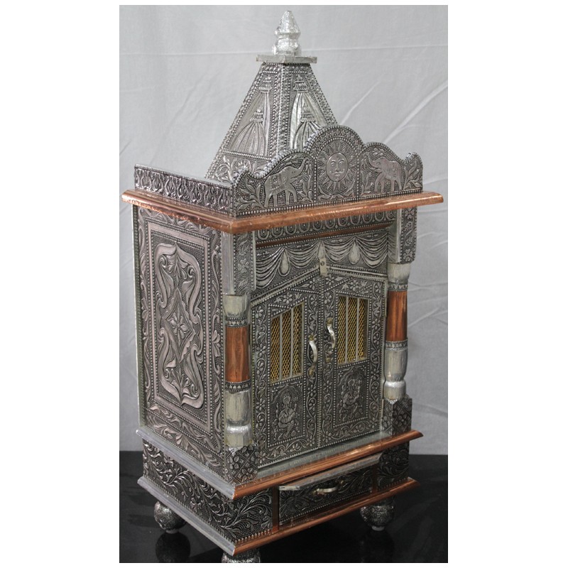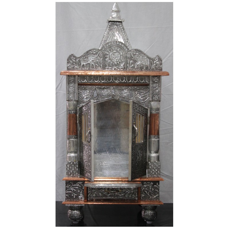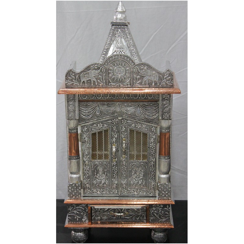Oxidized mandir erected from plywood and plated oxidized aluminum and copper. Oxidized temple uses tarnish proof and rust proof screws with quality nails.