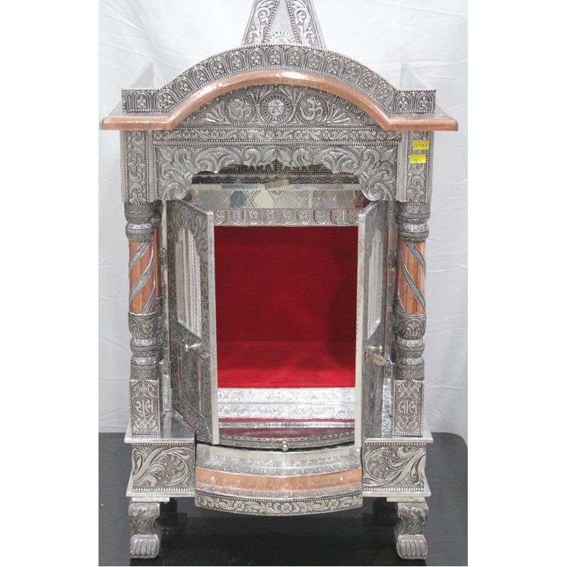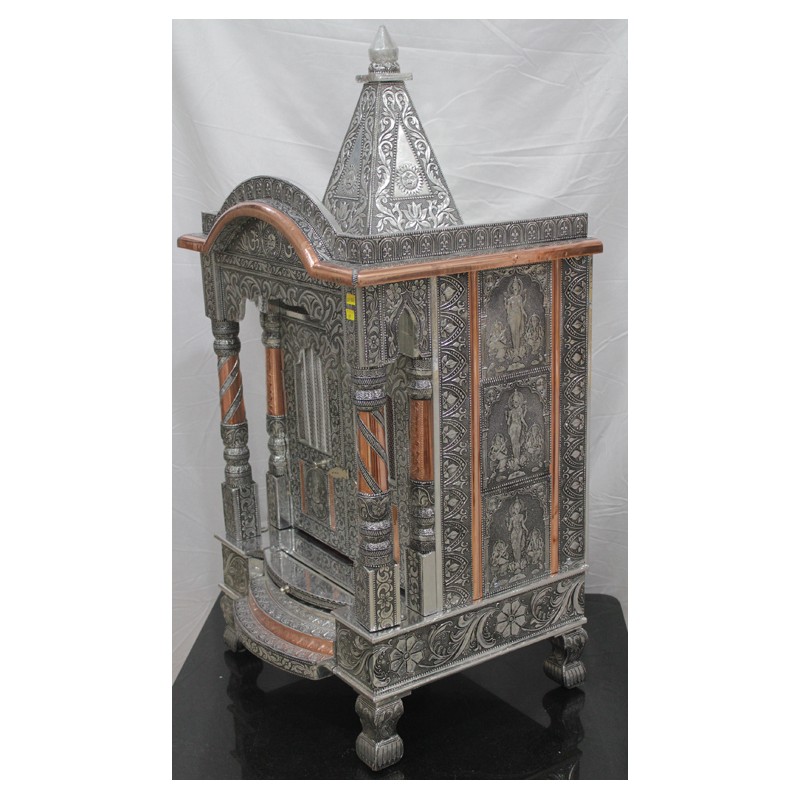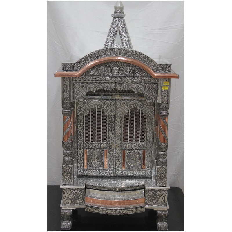 Oxidized mandir erected from plywood and plated oxidized aluminum and copper. Oxidized temple uses tarnish proof and rust proof screws with quality nails.