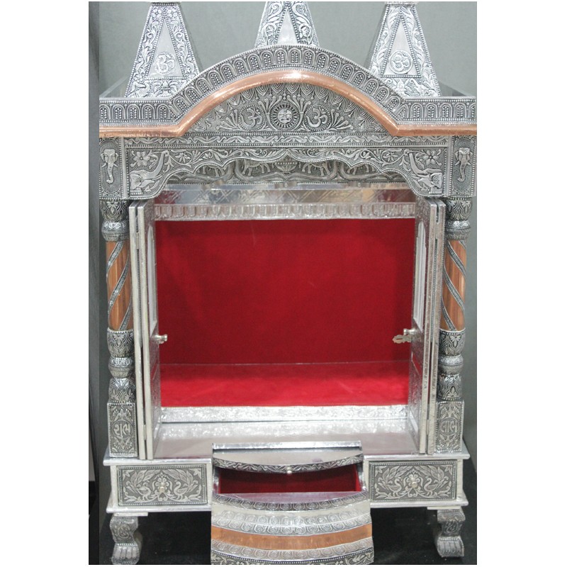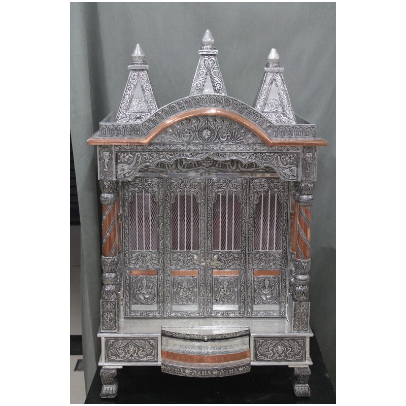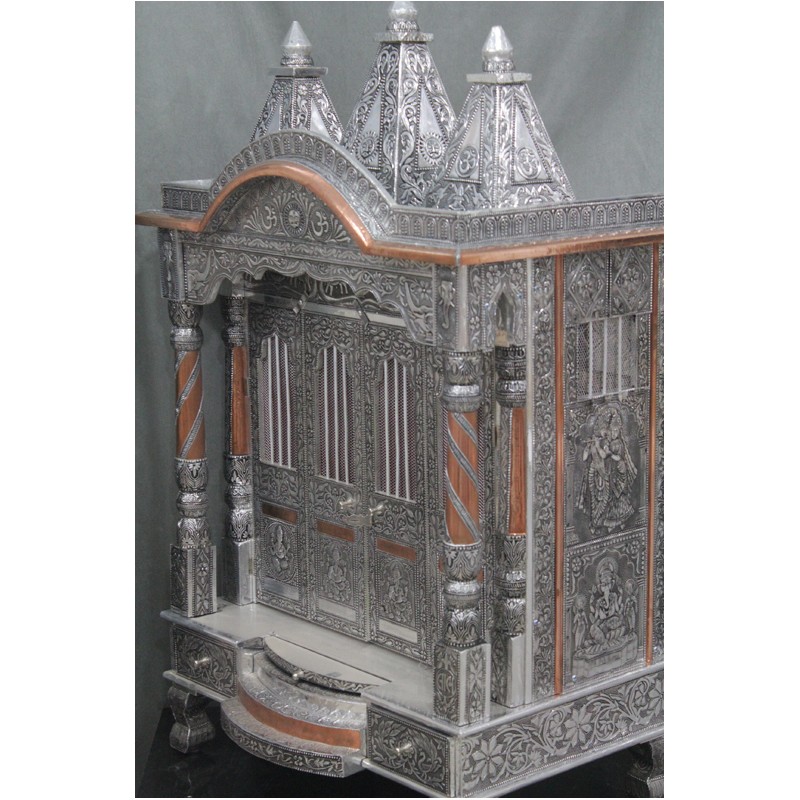 Oxidized mandir erected from plywood and plated oxidized aluminum and copper. Oxidized temple uses tarnish proof and rust proof screws with quality nails.