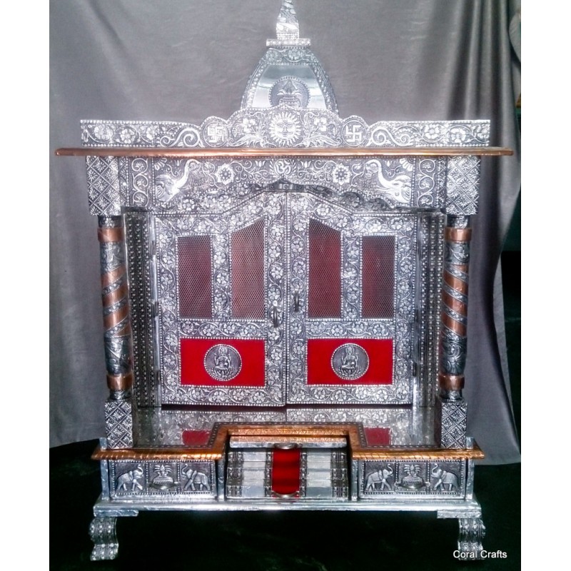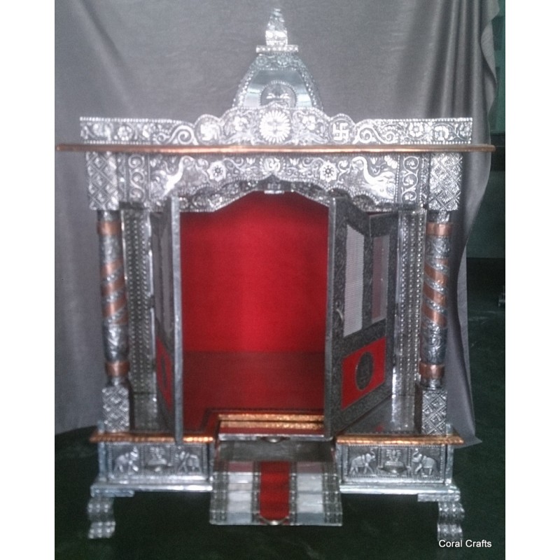 Oxidized mandir erected from plywood and plated oxidized aluminum and copper. Oxidized temple uses tarnish proof and rust proof screws with quality nails.