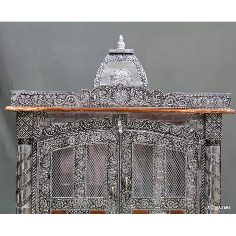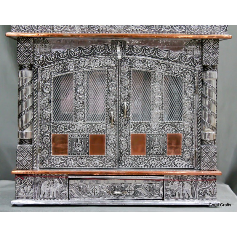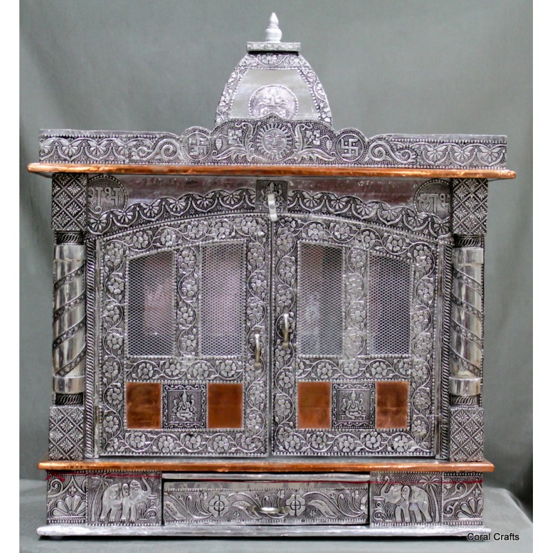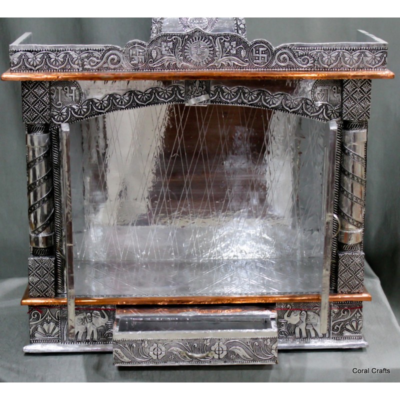 Oxidized mandir erected from plywood and plated oxidized aluminum and copper. Oxidized temple uses tarnish proof and rust proof screws with quality nails.