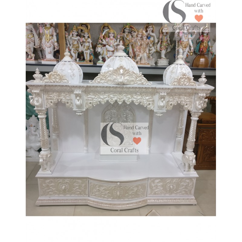 This beautiful temple has been carved from teak wood with the use of ply board and veneer. The temple shown herein is polished in marble finish.